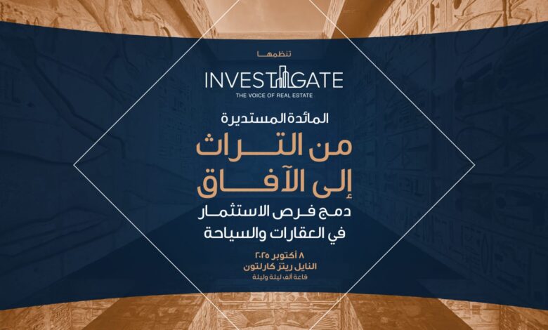 تستعد «إنفستجيت» لإطلاق النسخة السادسة والعشرين من مائدتها المستديرة، بعنوان: «من التراث إلى الآفاق: دمج فرص الاستثمار في العقارات والسياحة»، وذلك يوم الأربعاء الموافق 8 أكتوبر 2025، في تمام الساعة التاسعة صباحًا، بفندق «النيل ريتز كارلتون» – قاعة «ألف ليلة وليلة».