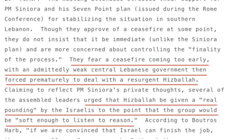 وثائق “ويكيليكس” لم تترك مجالاً للشك: فخلال العدوان الإسرائيلي على لبنان عام ٢٠٠٦، كان رئيس الحكومة آنذاك فؤاد السنيورة، مع قيادات “القوات اللبنانية” و”الكتائب” المسيحية اليمينية، يعملون على إطالة أمد الدمار. لقد صرّحوا للأميركيين بوضوح أنهم “يخشون من وقف إطلاق النار مبكراً”، بل حثّوا إسرائيل على “توجيه ضربة قاسية” لحزب الله، معتبرين أن خروجه من الحرب منتعشاً بانتصار وهمي “سيكون كارثة”.